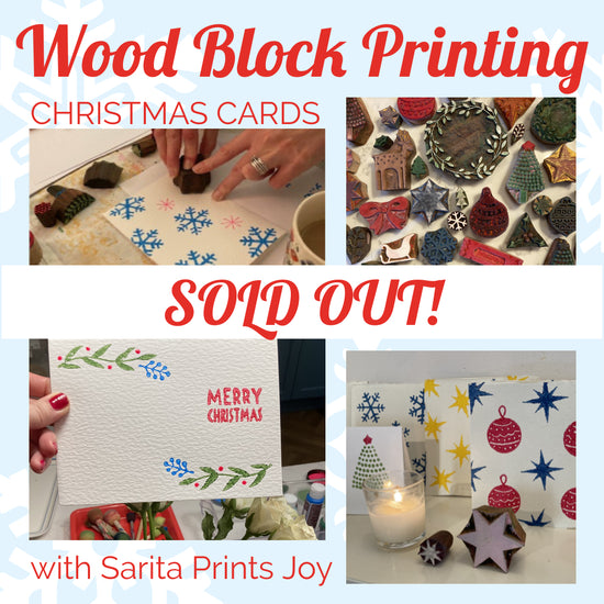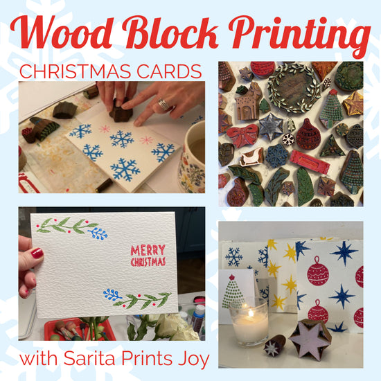 Design and print your own set of 6 Christmas cards. Using a gorgeous collection of hand-carved indian woodblocks, you'll learn how to create beautiful prints and playful layouts. You will also print a small canvas bag to store your cards which makes a lovely gift bag.