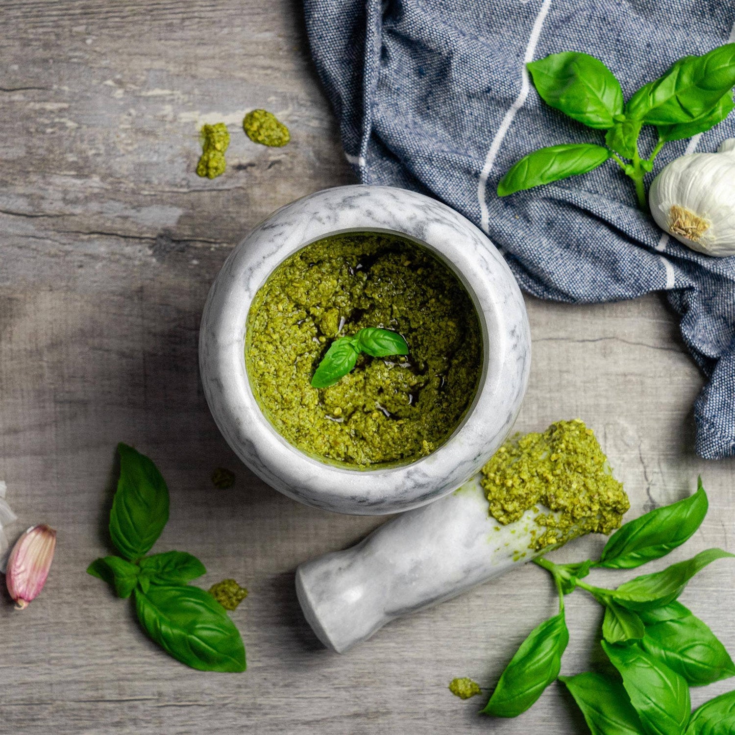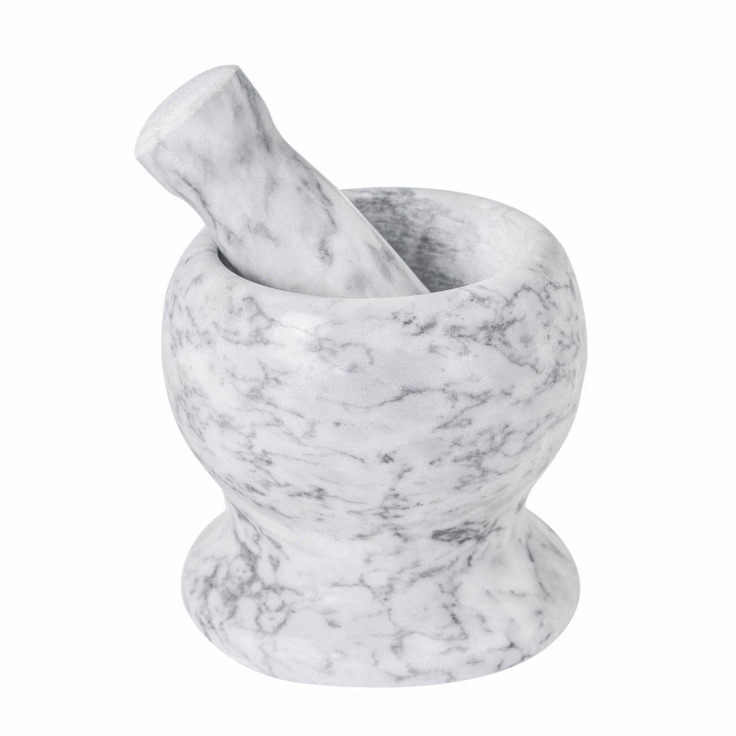 Natural marble pestle and mortar, beautifully shaped with deep well preventing contents from spilling out.