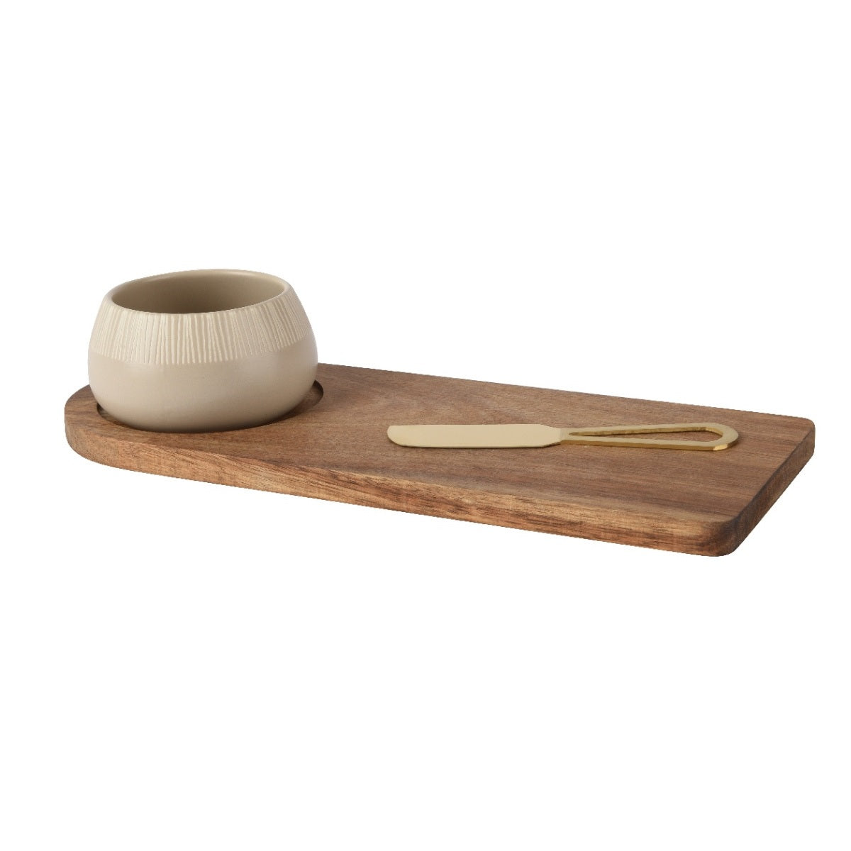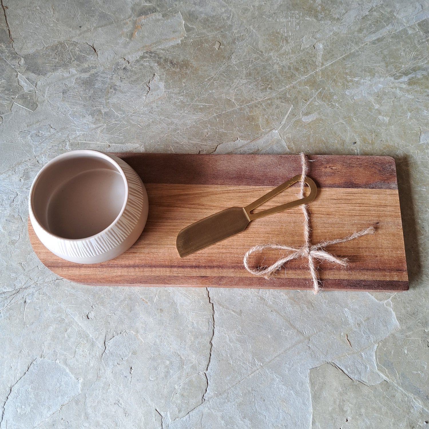 Wooden board with round dish for chutney or pickles and a cheese knife, makes a great gift!