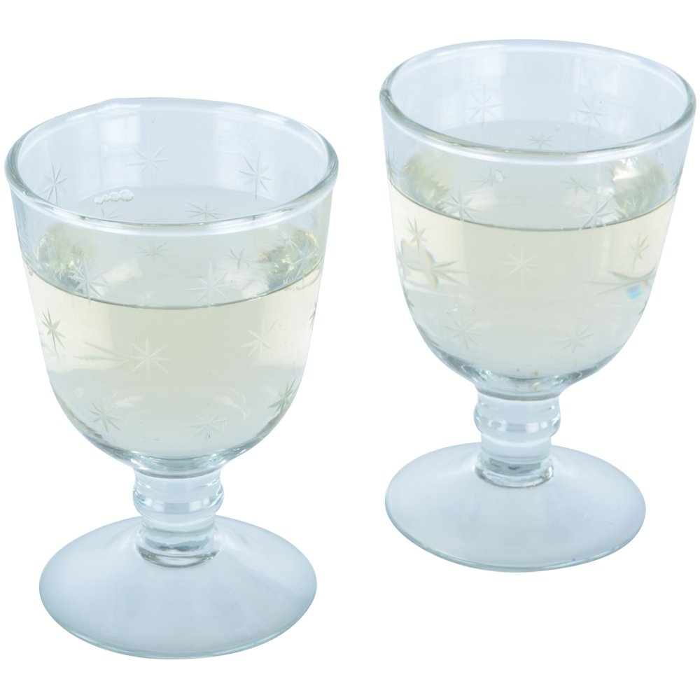 Vintage style short stemmed wine glasses etched with stars, made from 100% recycled glass, so no two are ever the same!