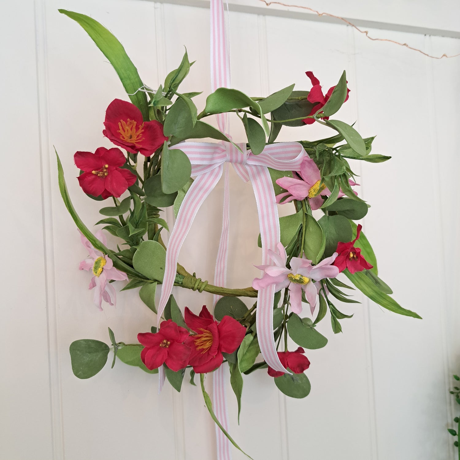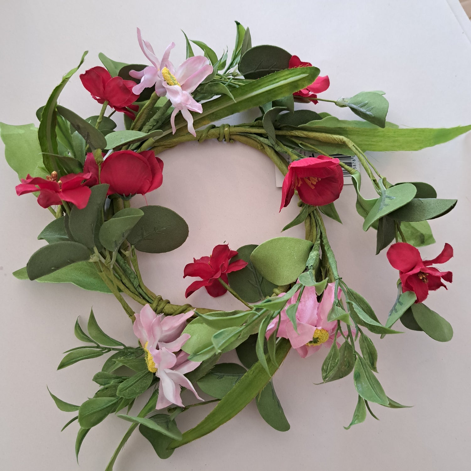 Faux pink an red flower wreath, ideally for hanging in windows and on doors or as a table centrepiece. Inner diameter approximately 11cm, outer diameter 25cm