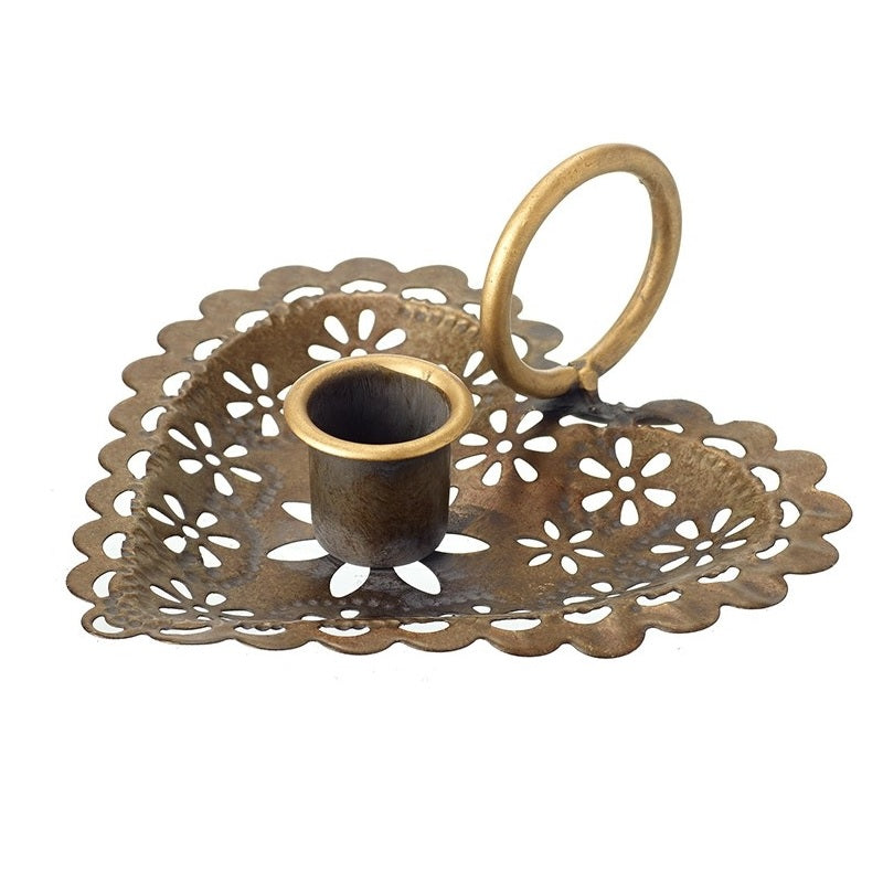 Heart shaped metal candle stick with pretty cut-out pattern and handle