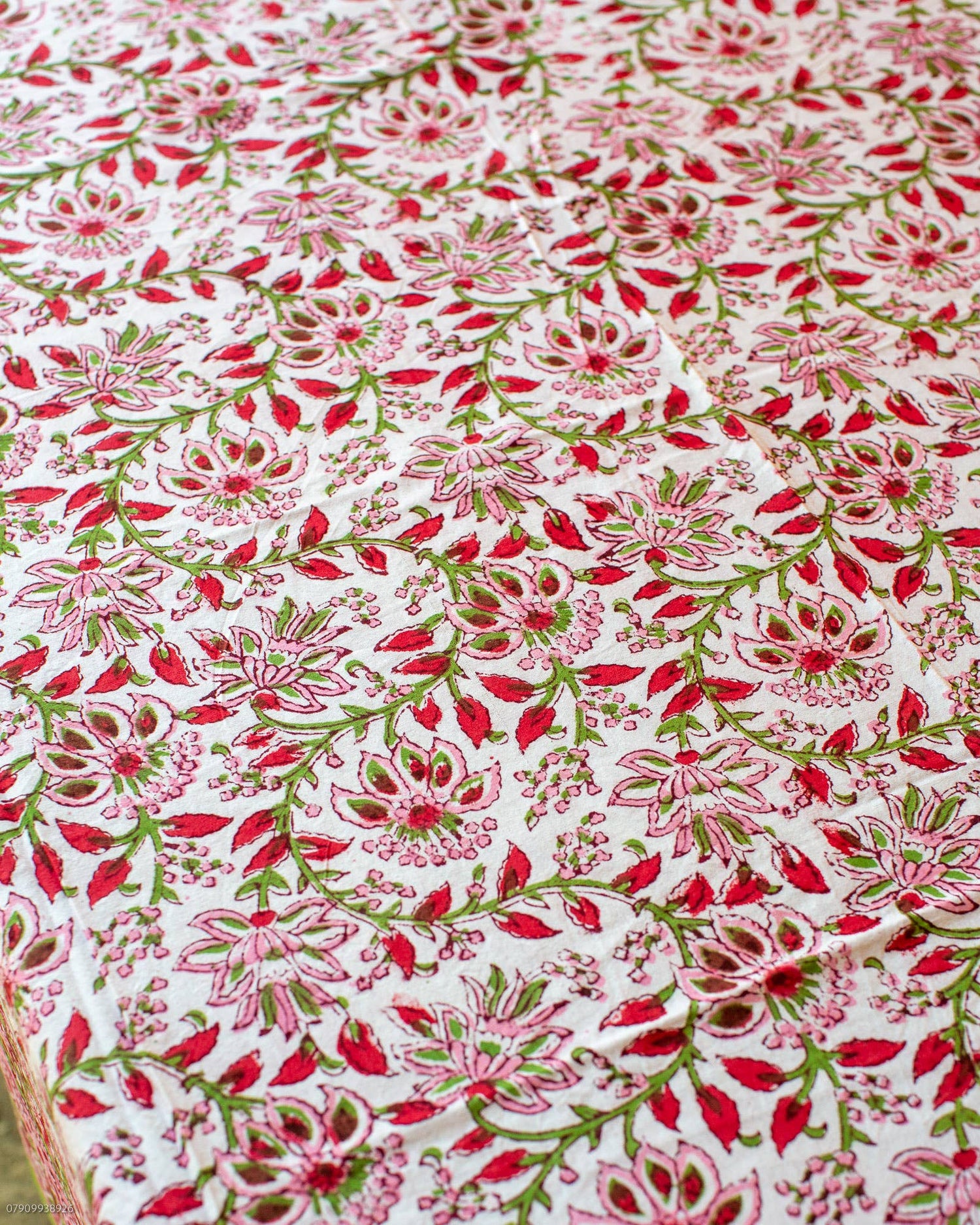 100% cotton tablecloth featuring a pink and green Indian block print floral design on a white background with a beautiful patterned border all round the edges. Each one is unique, colours and shades do very.