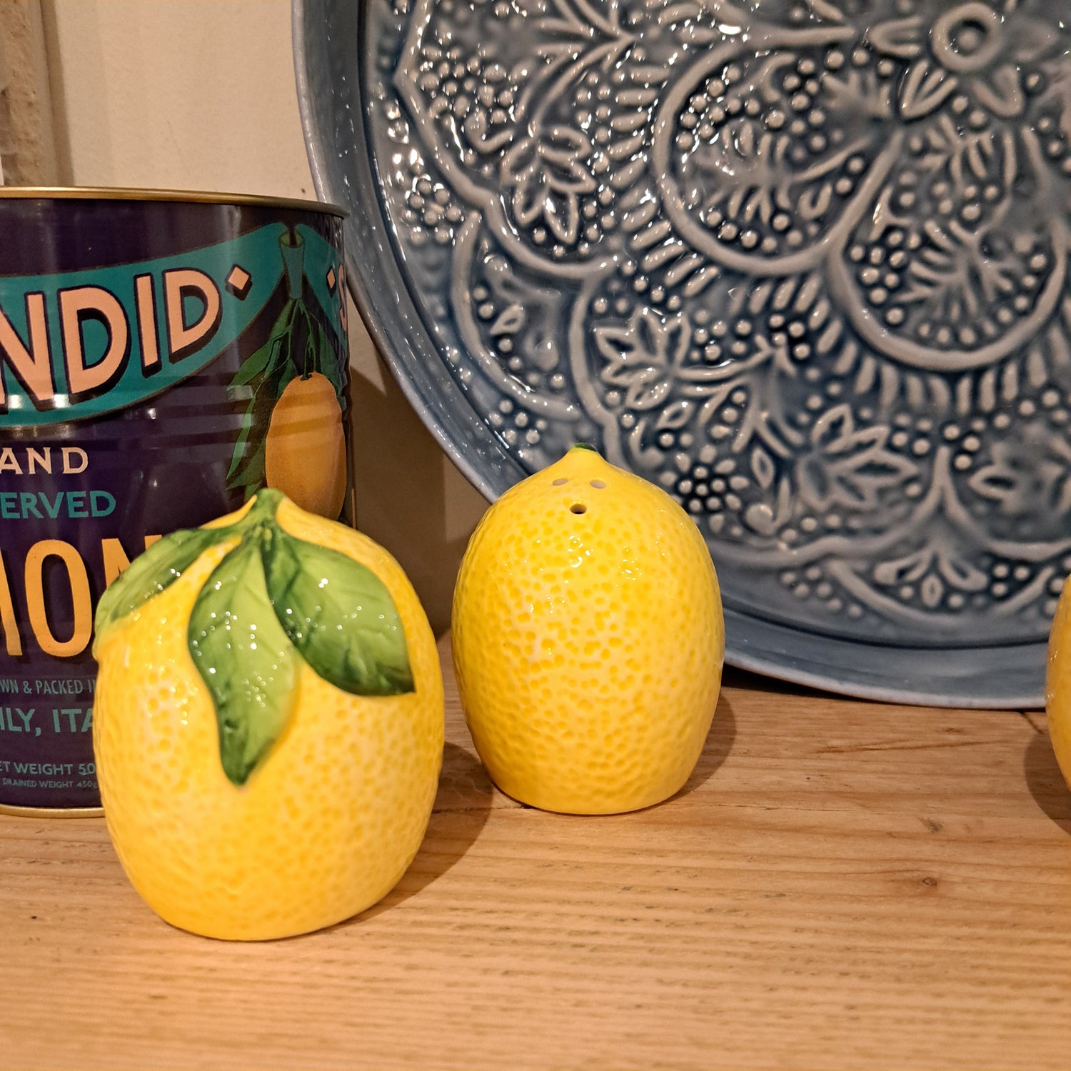 Glazed ceramic salt and pepper shakers in the shape of lemons.