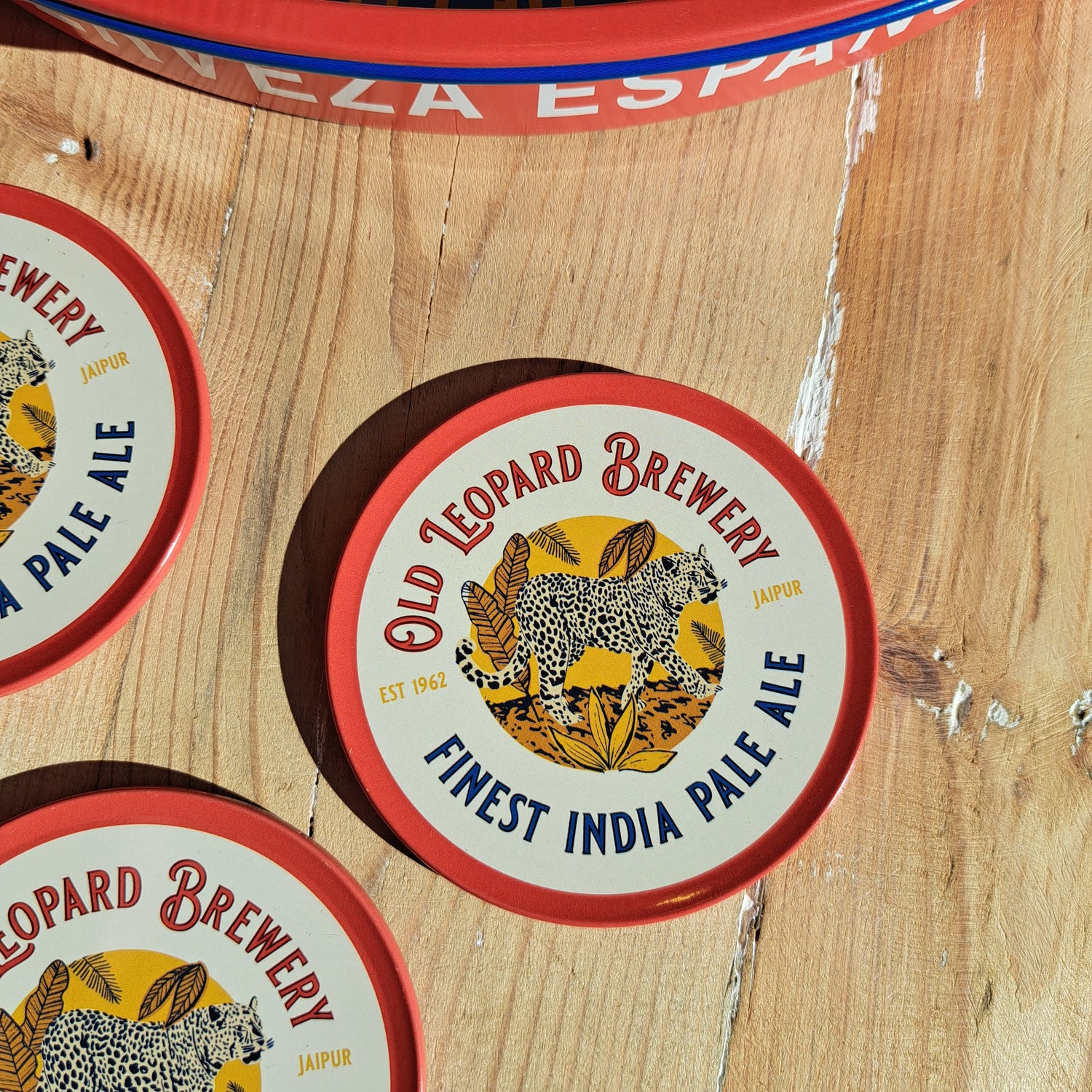 Set of four metal coasters with cork backing and a beautiful print of a leopard and "Old Leopard Brewery Finest India Pale Ale" branding, inspired by vintage Indian beer packaging. Comes with a storage tin featuring the same print.