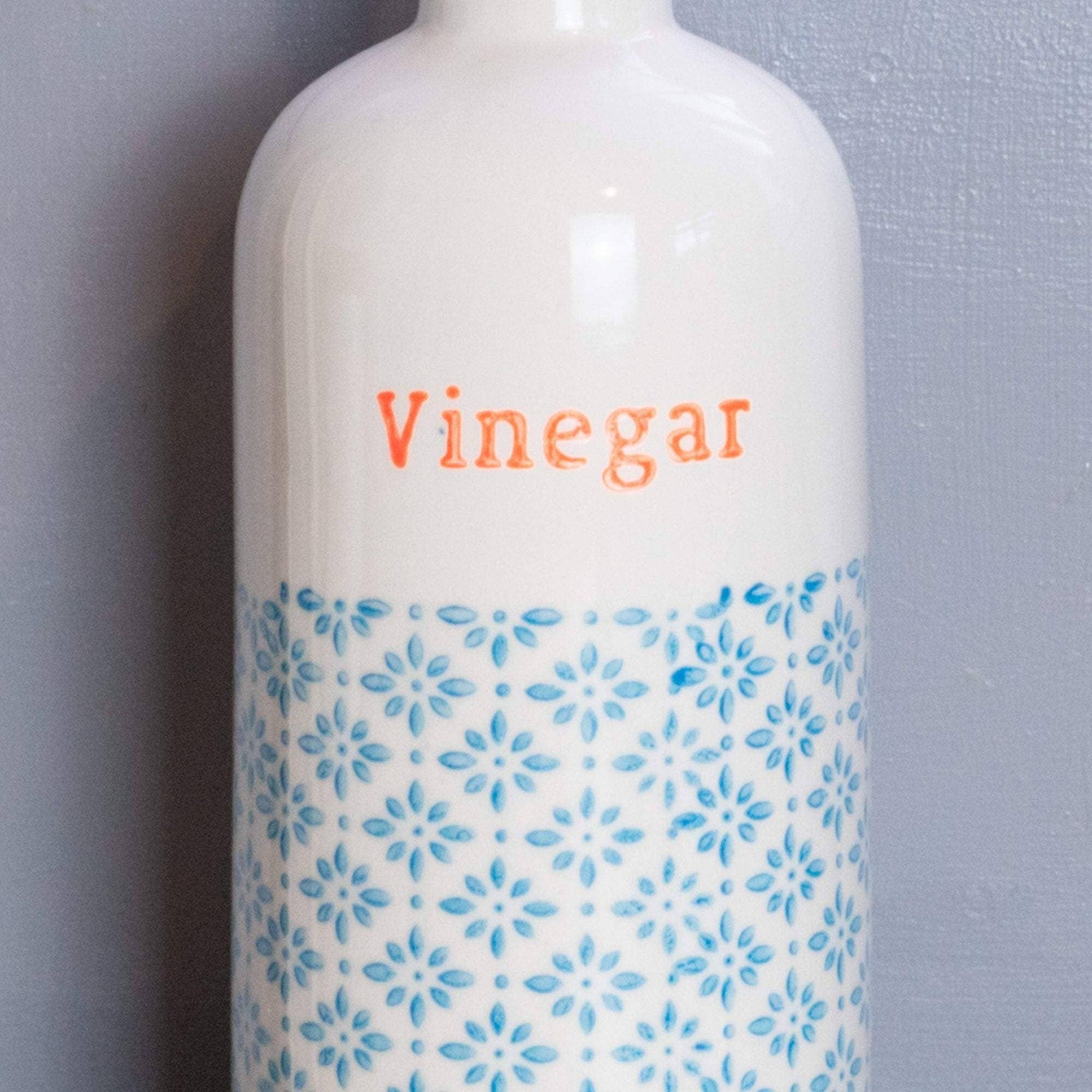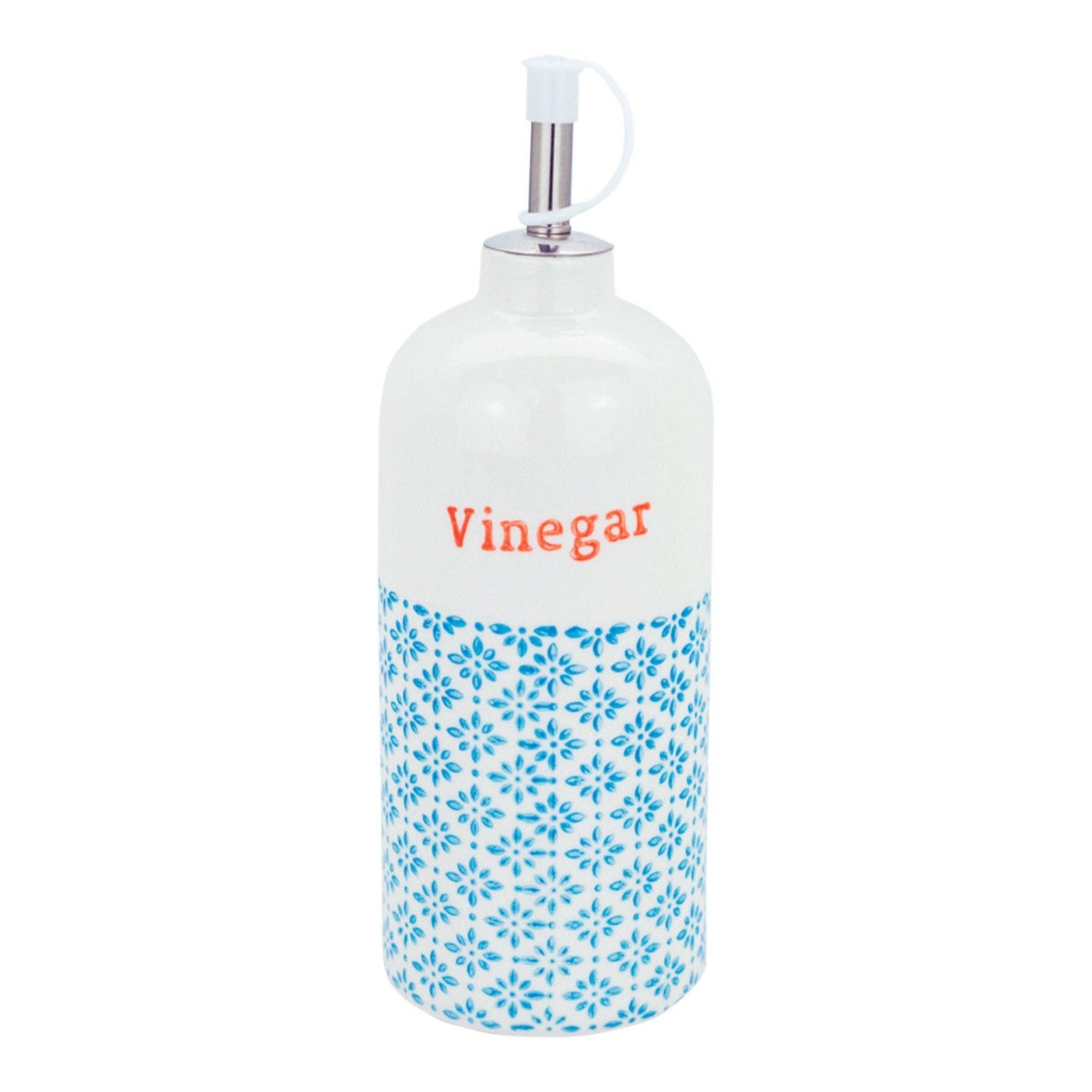 500ml vinegar bottle with stainless steel pourer spout and hand-printed pattern. Fully vitrified porcelain so microwave and dishwasher safe.