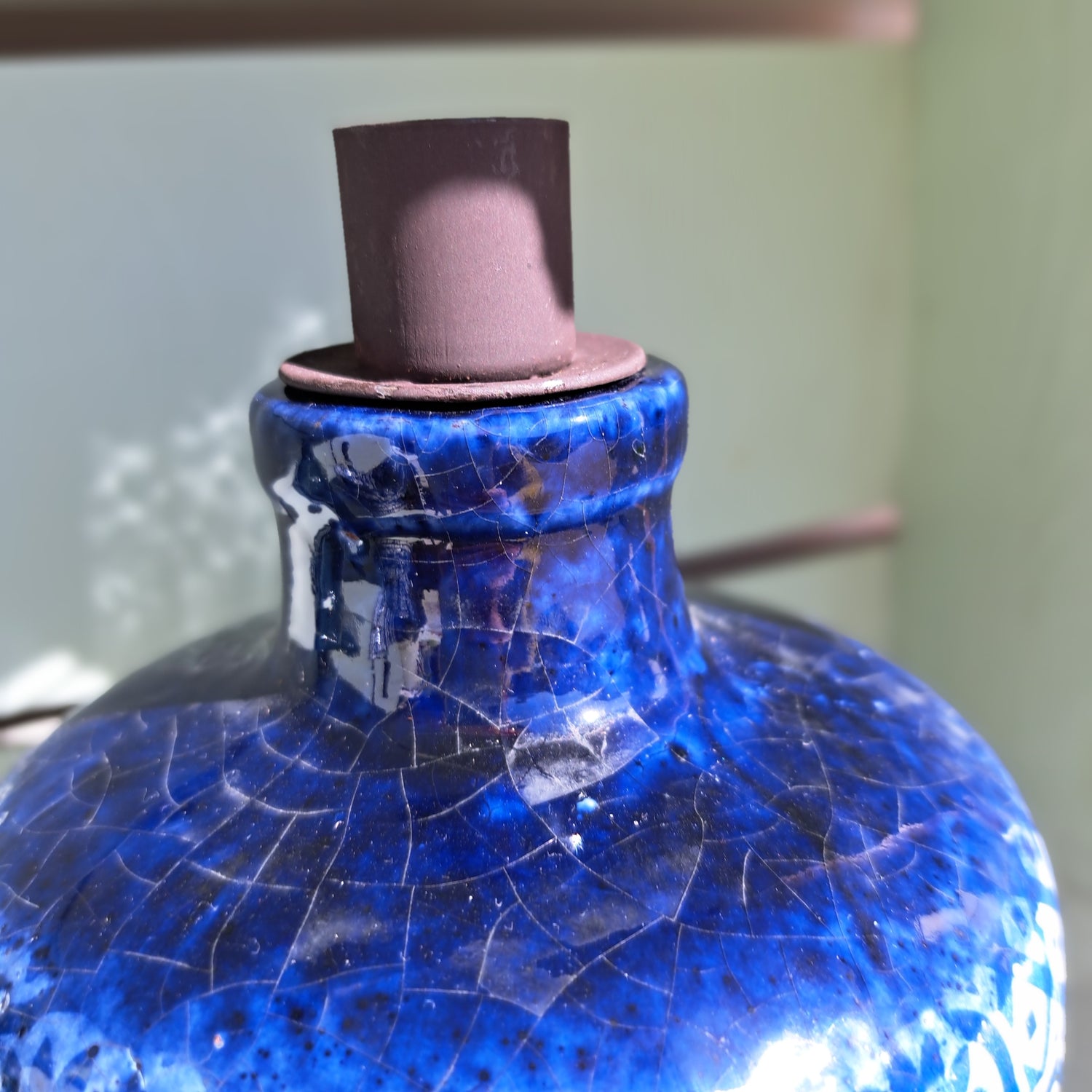 Stunning Moorish design in blue on this vintage style bottle with removable metal candle holder.