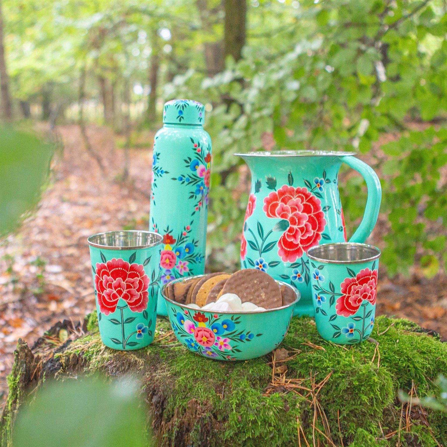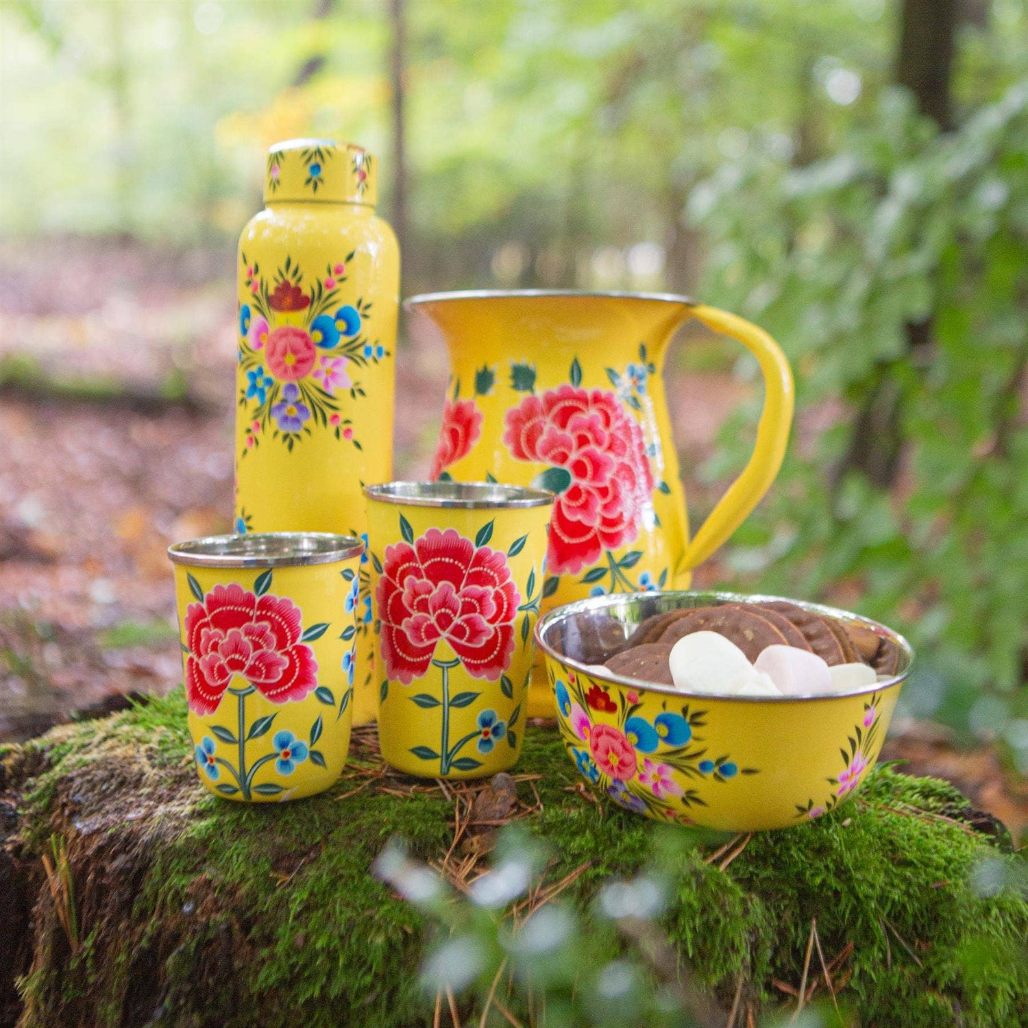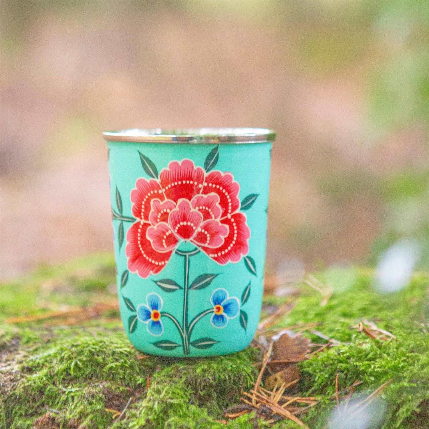 Beautiful, vibrant hand-painted floral decoration on this stainless steel beaker, jut stunning! The capacity is 300ml, diameter 7.5cm and height 11.5cm