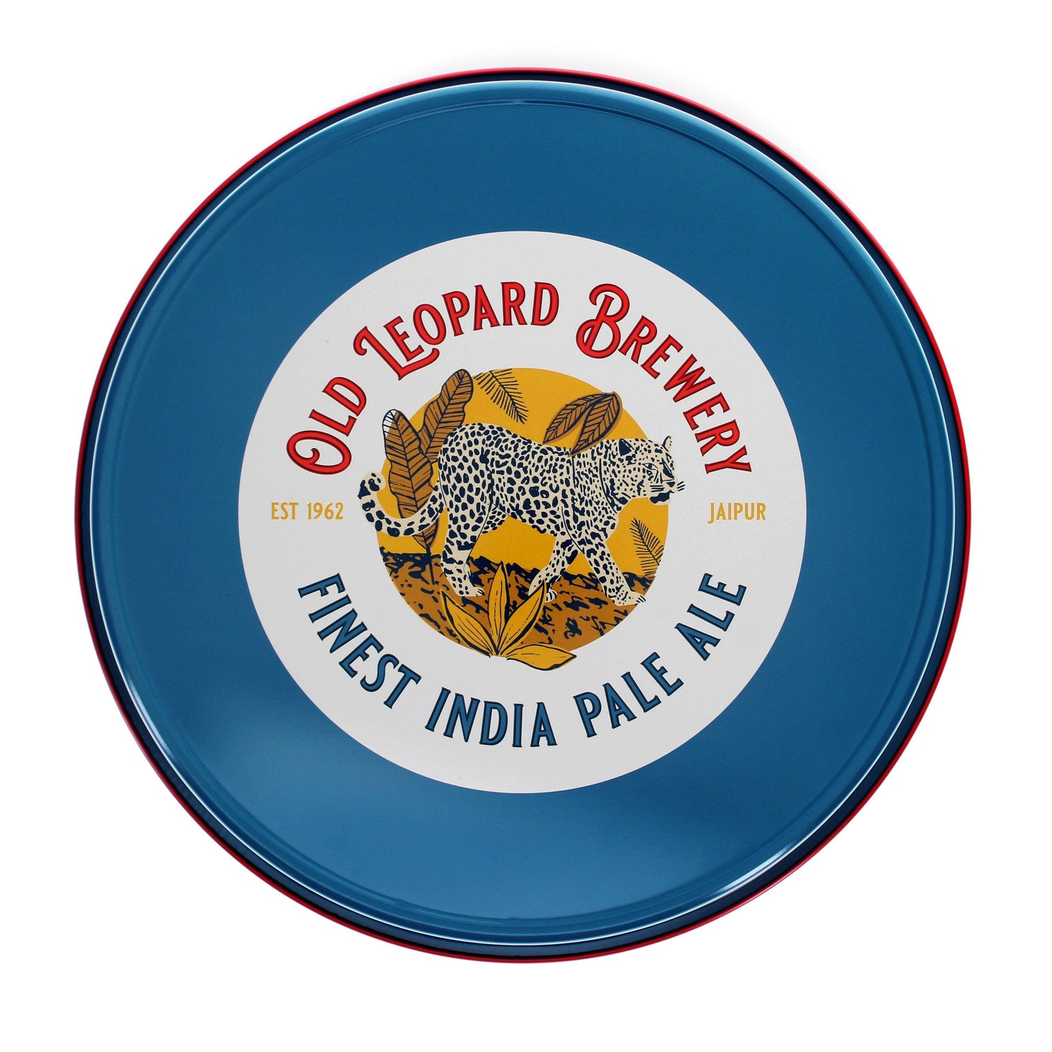 Round metal serving tray, featuring a beautiful print of a leopard and "Old Leopard Brewery Finest India Pale Ale" branding, inspired by vintage Indian beer packaging. Co-ordinate with matching coasters...