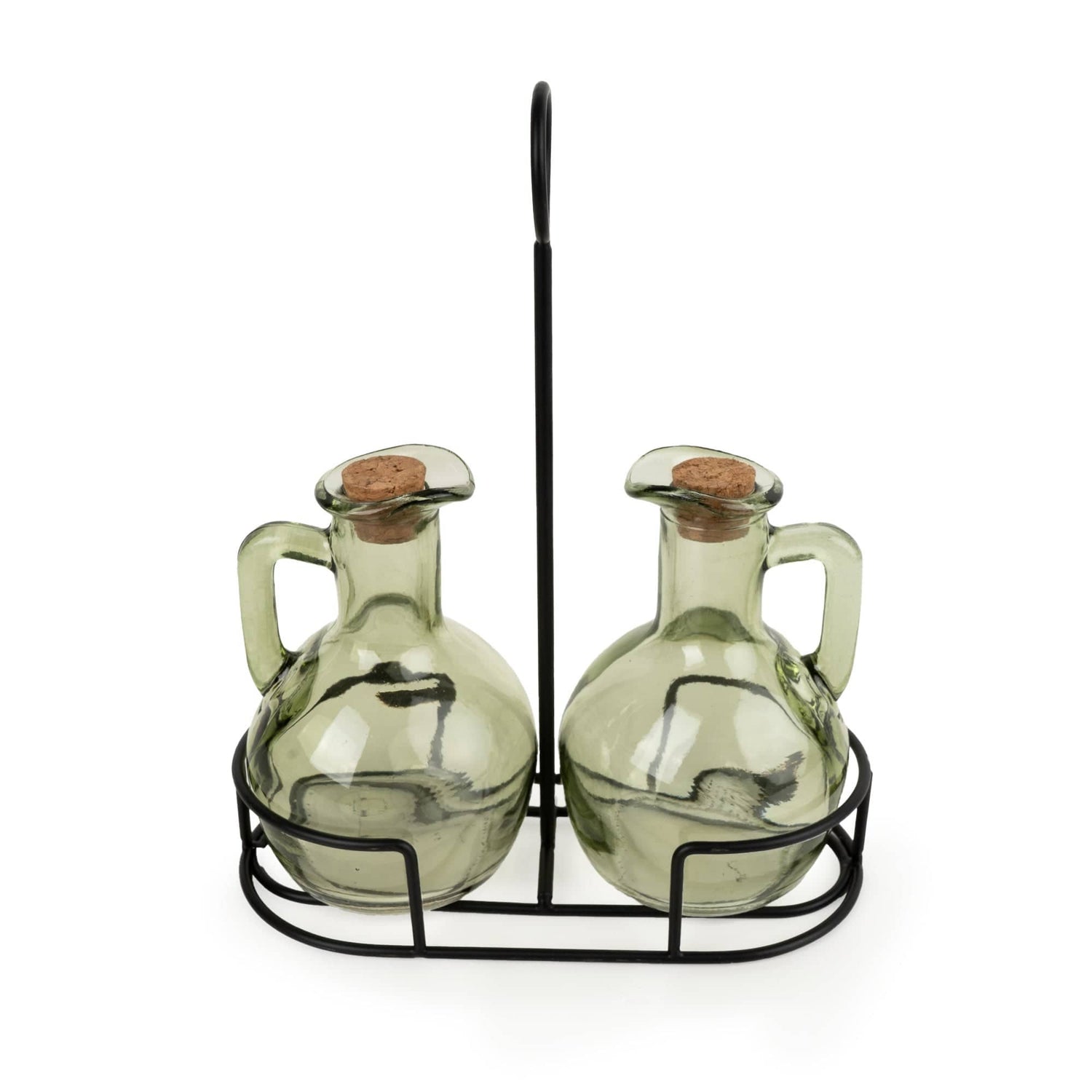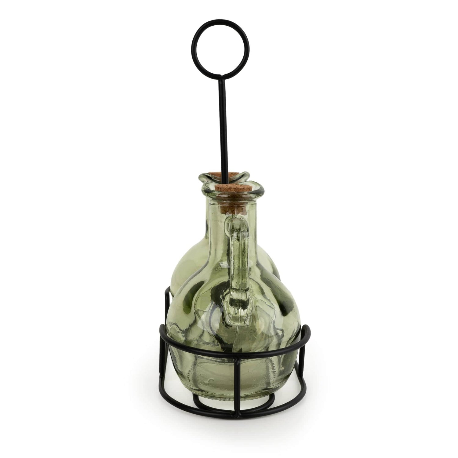 Set of 2 green bottles on a stand. Each bottle is crafted from subtly tinted green glass, complete with a cork stopper and a curved handle for easy pouring. Housed in a sleek black wire stand with a central carry loop, this set blends functionality with timeless style. Ideal for presenting olive oil and vinegar or your favourite infused blends, it's a practical and attractive addition to any home.