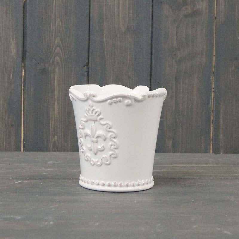Vintage style white ceramic pot with raised Fleur De Lis design. External diameter at widest point approximately 12cm x 11cm high