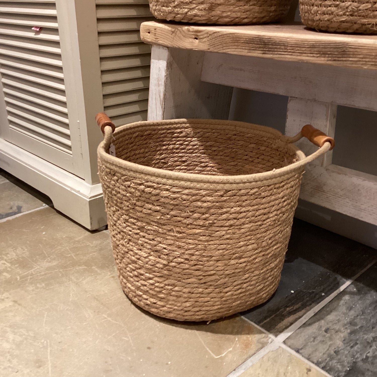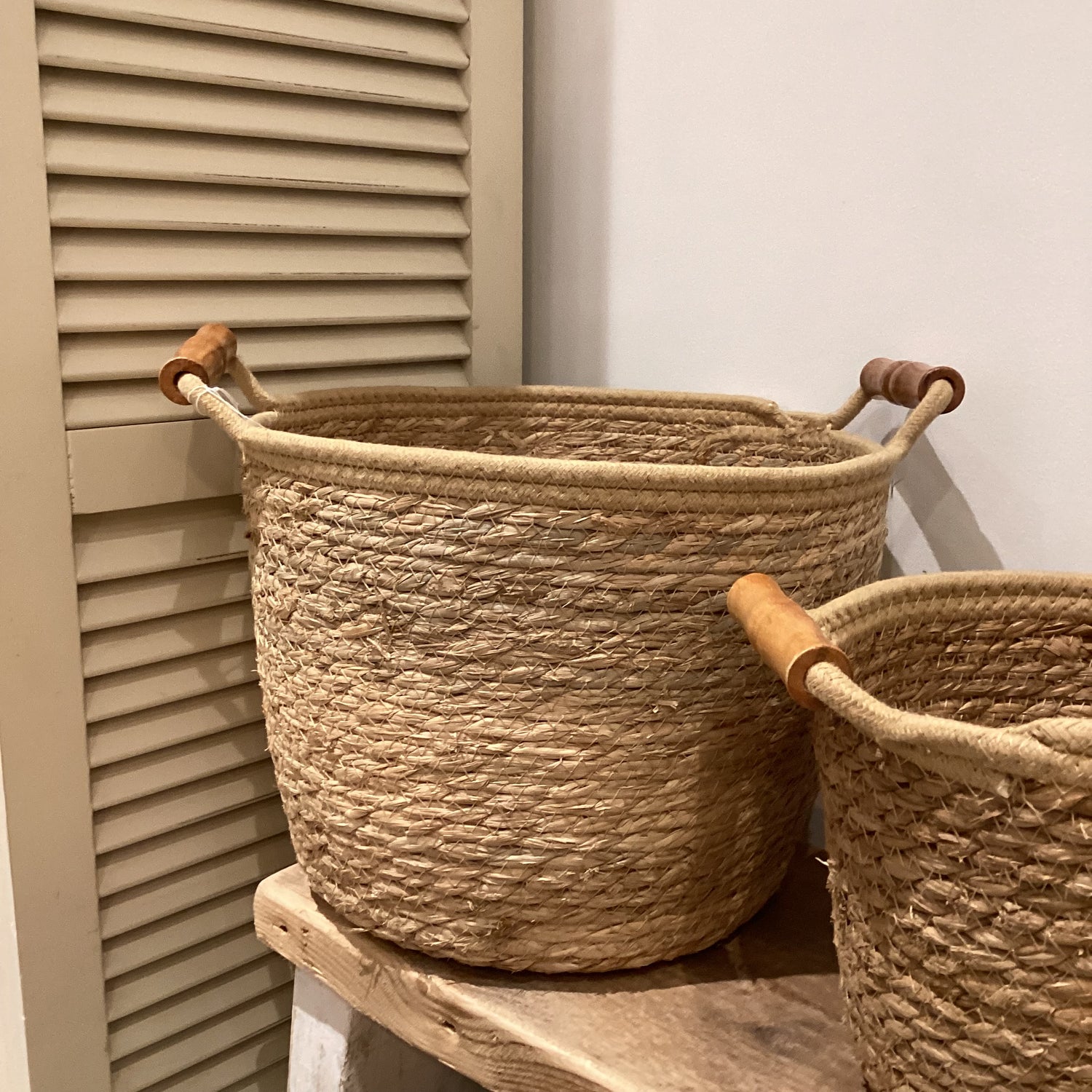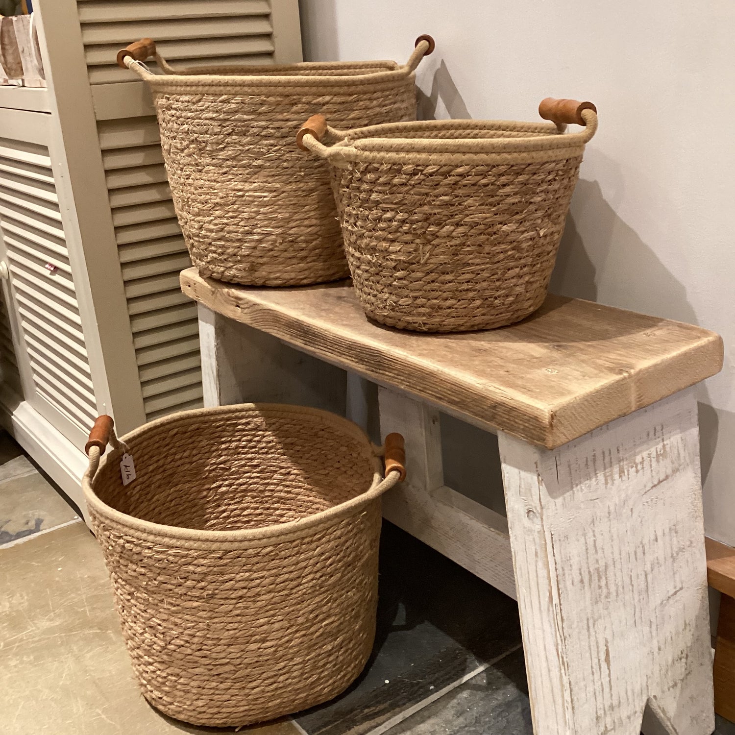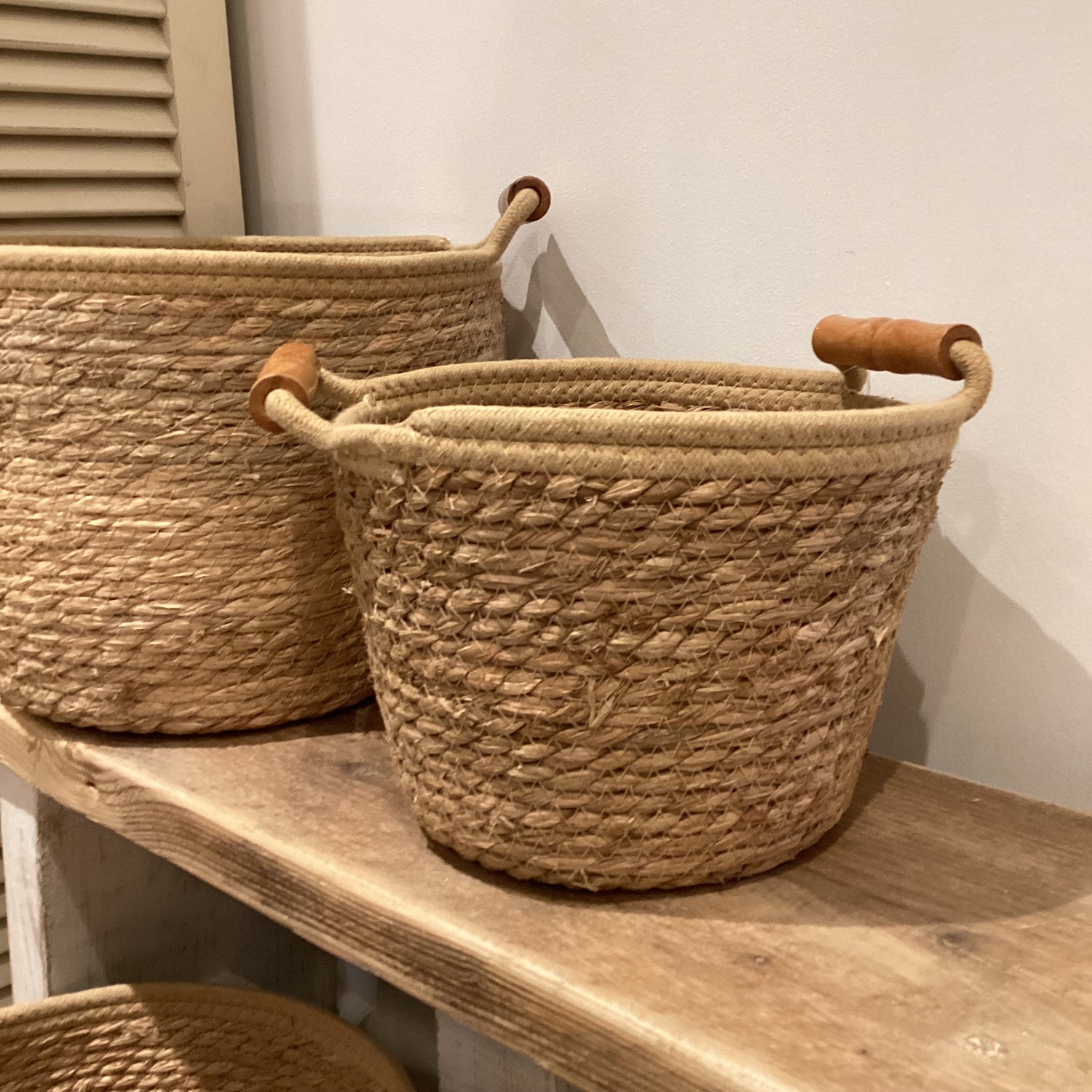 Baskets in a natural finish with Woden handles and rope trim. Available in three sizes.